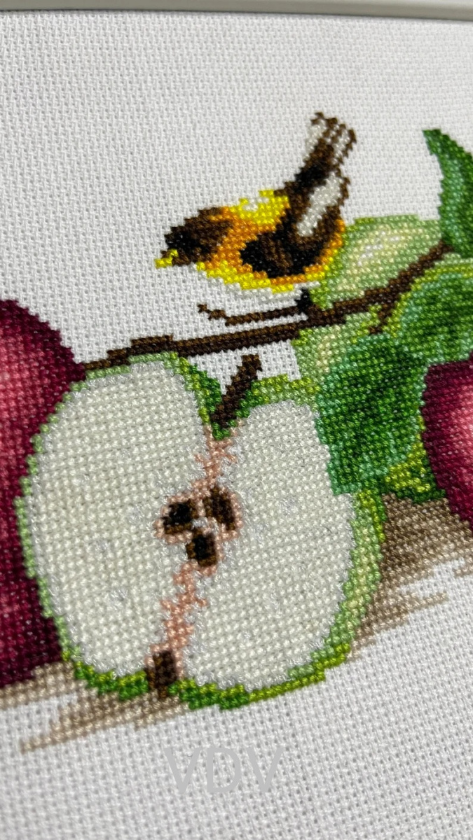 Використовуються стібки: повний хрестик, півхрестик, стібок "назад голку" (бекстіч) та французькі вузлики. За бажанням французькі вузлики можна замінити бісером 10/0.