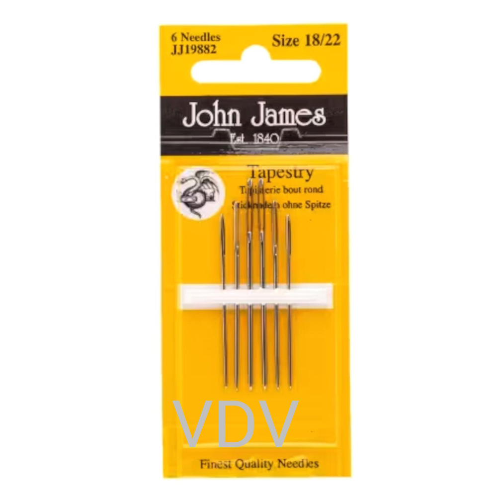 Гобеленові голки John James JJ19882E №18/22 - універсальний набір голок для вишивки хрестиком, гобеленової та лічильної вишивки. Голки мають велике вушко для легкого заправлення нитки та тупий округлий кінчик, який безпечно проходить між волокнами тканини, не пошкоджуючи канву. Розміри №18 та №22 підходять як для роботи з грубішими матеріалами, так і для більш детальної вишивки на канві Aida, Binca, пластиковій канві та тканинах з відкритою сіткою. Ідеальні для використання з вовною, м’якою вишивальною бавовною та бавовняними нитками. У наборі 6 голок, виготовлених в Англії, що гарантує високу якість, довговічність і комфорт під час вишивання.